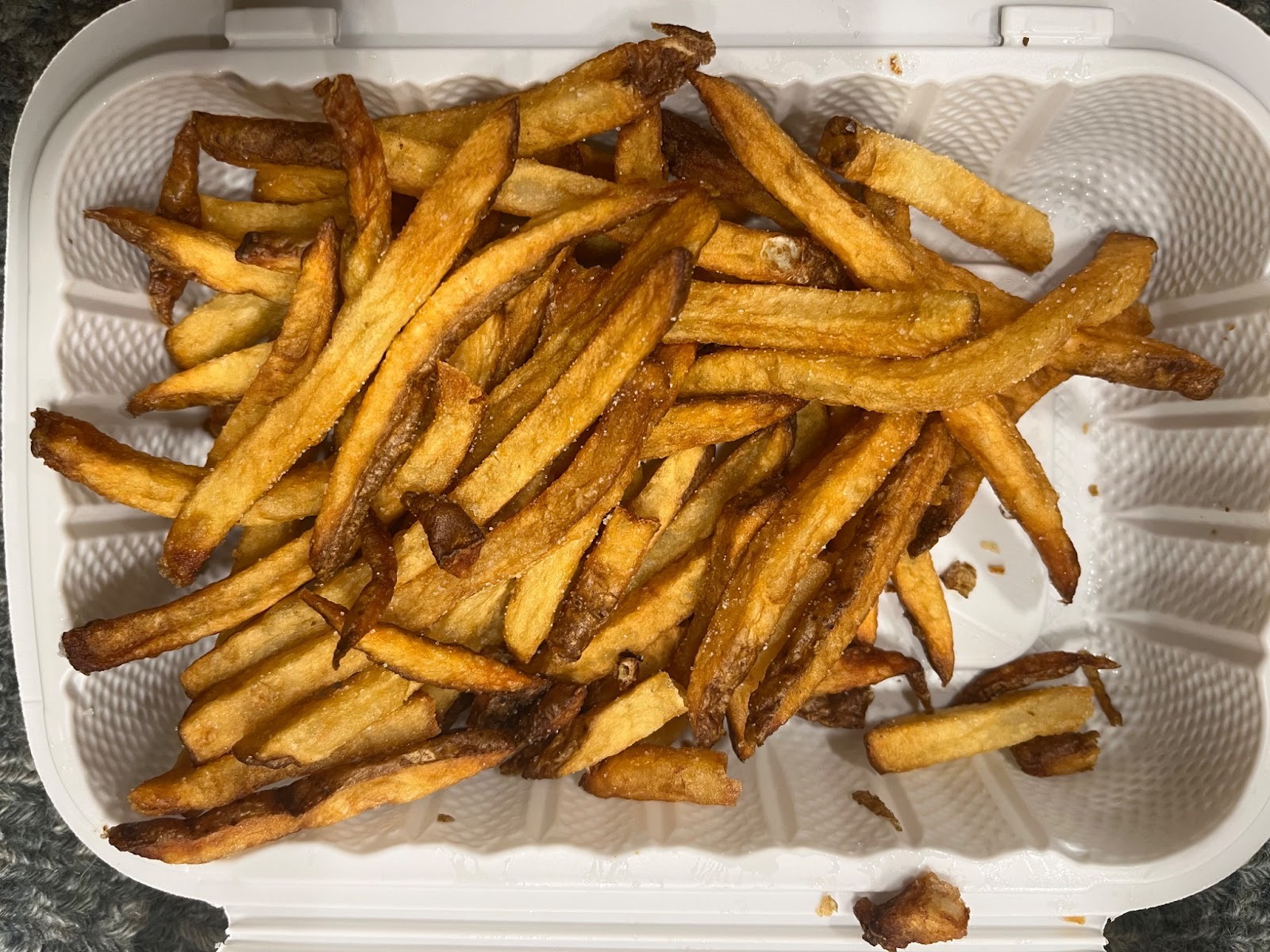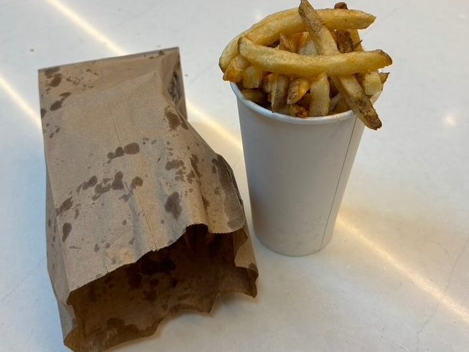 A heeeeeefty amount of fries are dumped to the brim of a tall paper cup carelessly placed inside a greased-up paper bag. It isn’t the most eye-catching presentation, but it’s true to its spirit. What you see is what you get.